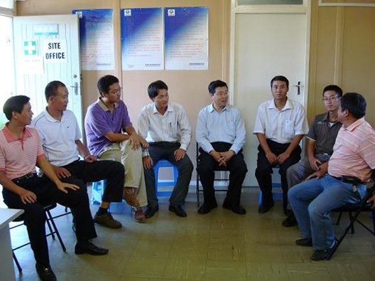 参观完工地后,房利总领事一行在项目部负责人的陪同下来到援建人员的宿舍,看望了工程技术人员,实地了解项目人员的生活条件和安全状况。房利总领事和大家亲切交流,嘱咐全体同志要以中南两国关系为重,努力工作,保持工程进度和质量,妥善处理好与南非当地政府、合作伙伴和雇佣工人的关系,为中南友谊做出贡献。