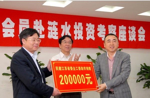 26日下午,考察团在涟水县人民政府召开座谈会。会上,民建会员、江苏省建集团董事长陈正华代表省民建企工委将20万元捐款交给该县教育局局长鲁家宁,用于帮助当地贫困学生完成学业,将全省民建会员和全体省建人的爱心向涟水县的孩子们传递。