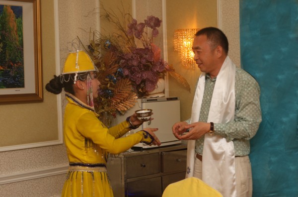 ■ 欢迎酒会上,新疆姑娘向陈正华董事长敬献哈达
