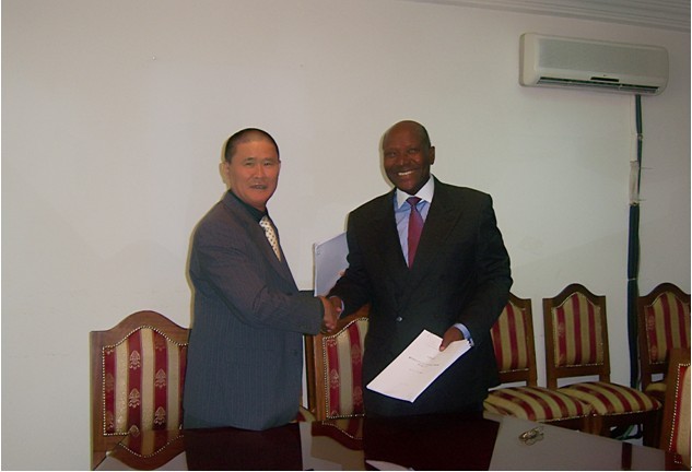 ■ 集团公司商务代表张自江与科特迪瓦外交国务部敦坎(右)部长庆祝项目签约成功