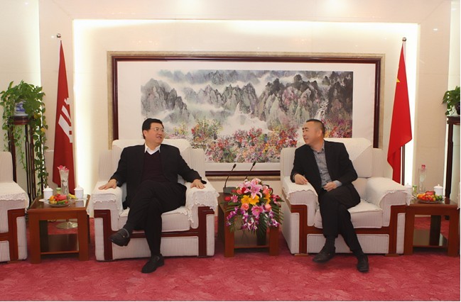■ 罗一民(左)副主席听取陈正华董事长的企业情况汇报