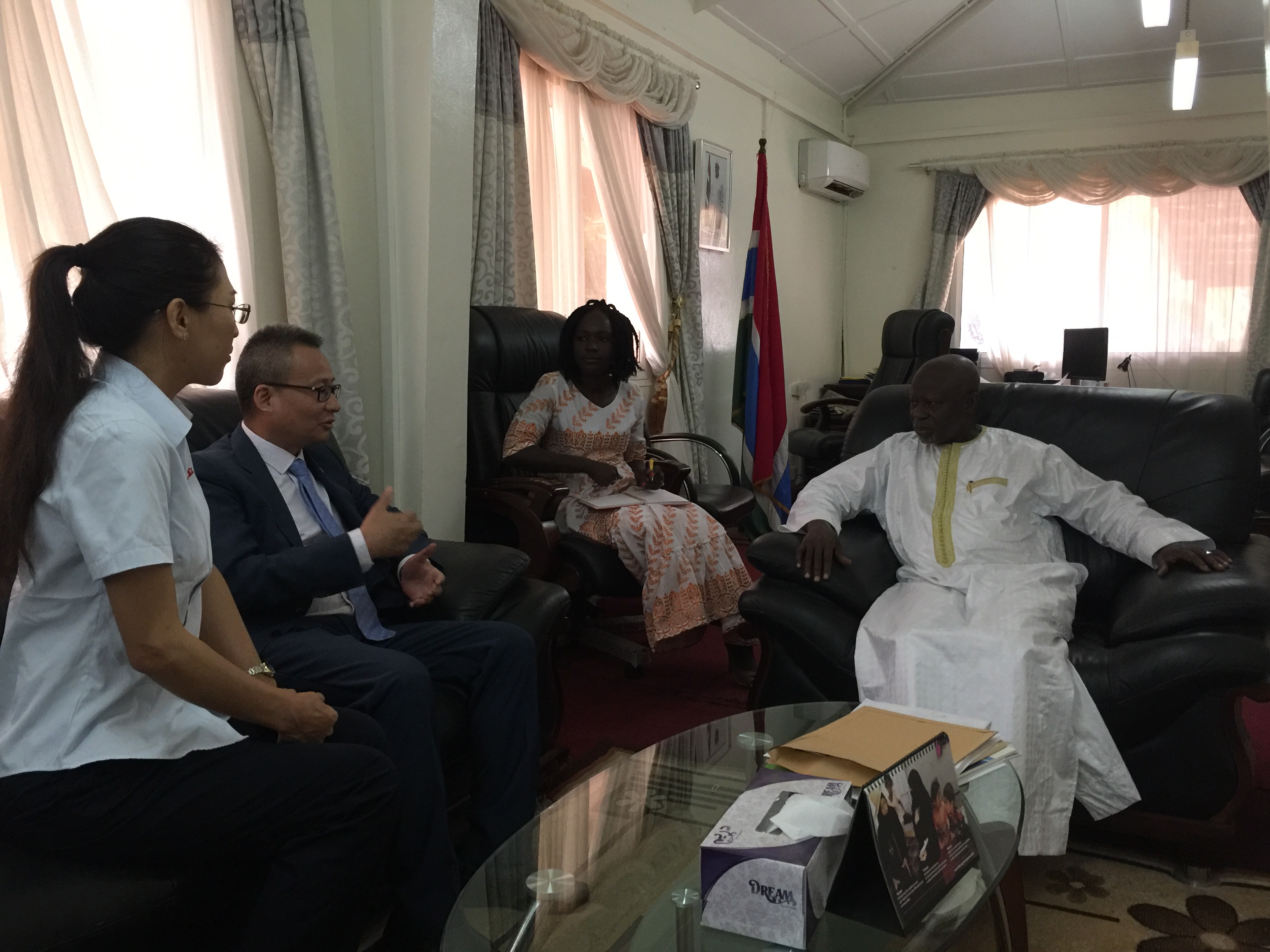 仪式开始前,仇天青总裁还专程前往冈比亚外交部和工程部,分别拜访了达博外长和乔贝部长。